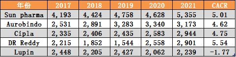 2021年,印度top5仿制药巨头分别为太阳、阿拉宾度、西普拉、瑞迪博士和鲁宾,总营收分别为53.55亿美元(平均汇率,下同)、31.73亿美元、29.44亿美元、29.01亿美元和22.39亿美元。相比瑞迪博士和兰伯西,太阳制药和阿拉宾度都是后起之秀,销售额是在2010年之后才实现了逐渐反超。DR. Reddy曾超越了兰伯西而成为印度仿制药界的领头羊,但该公司在2010年后,业务发展遇到了瓶颈,销售额陆续被几大企业反超,目前仅名列第四。