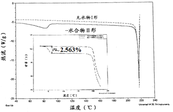 图2无水物I形和水合物II形的热分析图谱(来源文献1的专利)