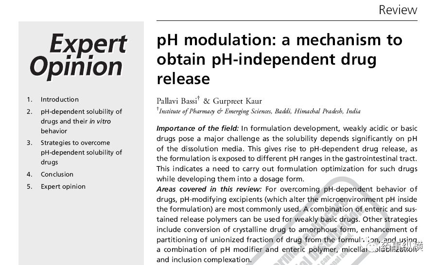 在处方开发时,弱酸性或弱碱性药物是研究的重大挑战,因为其溶解度很大程度上取决于溶出介质的pH。本文着重于克服上述挑战,从而促进制剂的发展,使其溶出不依赖于pH。