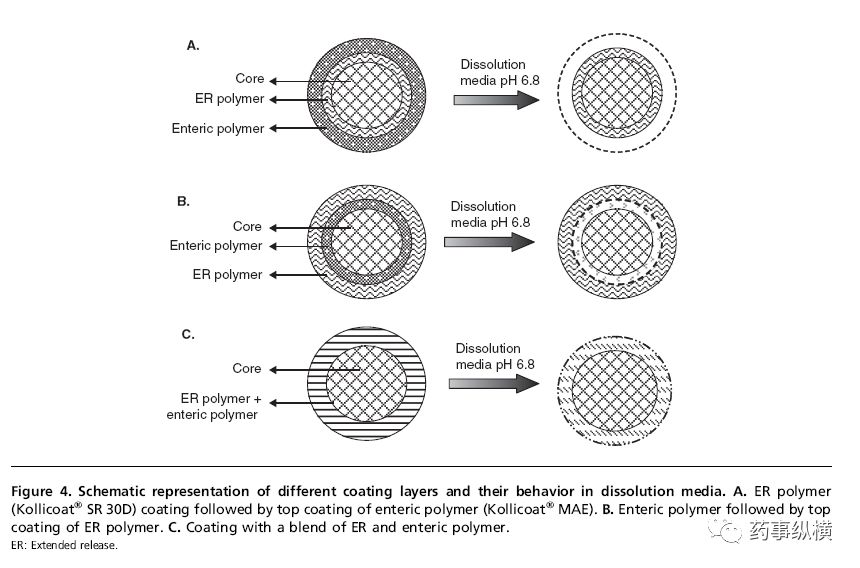Dashevsky等人研究了用肠溶聚合物和不溶性缓释(SR)聚合物包衣维拉帕米微丸。使用的不溶性缓释聚合物是KollicoatSR 30D(BASF,德国)(聚乙酸乙烯酯的水分散体),使用的肠溶聚合物是KollicoatMAE 30DP(甲基丙烯酸和丙烯酸乙酯共聚物的水分散体; C型甲基丙烯酸共聚物)。以三种不同的方式对微丸包衣(图4):包衣方式A:先用不溶性缓释聚合物(Kollicoat SR 30D)包衣、接着用肠溶聚合物的在缓释层外包衣(KollicoatMAE 30DP); 包衣方式B:先用肠溶聚合物包衣,再用不溶性缓释聚合物包衣; 包衣方式C:不溶性缓释聚合物和肠溶聚合物的混合物包衣。
