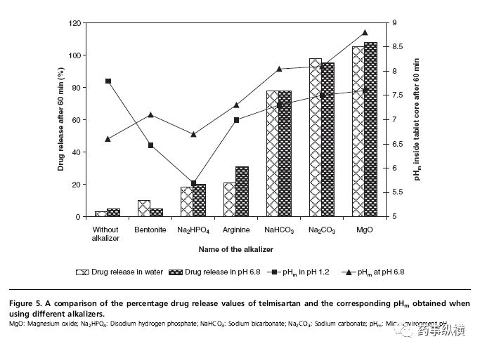 为了了解提高溶出的机制,测定了各种片剂的pHm。含有高岭土、Na2HPO4和精氨酸的片剂的pHm值(图5)不足以达到片剂中的基本环境,因此释放量较低。含MgO、Na2CO3和NaHCO3的制剂pH依次降低。释放量随着碱化剂的量增加而增加。然而溶出速率的增加与微环境pH的增加并不成正比,提示我们还有其他一些机制起作用。