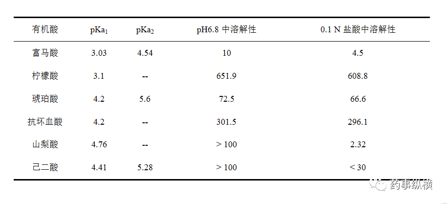 Siepe等人通过测量酸在制剂中的滞留时间,通过比较富马酸(FA)和琥珀酸(SA)在双嘧达莫包衣片中的滞留时间来比较相对疗效。在pH1.2和pH6.8中SA比FA溶解度高(表2)。在4小时后SA从制剂中浸出,而由于其低溶解度,FA保留在制剂中并且能够有效地控制pH值6h,表明FA是比SA更好改善药物释放的有机酸。在另一项研究中发现,当双嘧达莫与FA或SA(作为pH调节剂)配制成基于羟丙基甲基纤维素(HPMC)作为基质的微片时,与1小时后浸出的SA相比,FA的停留时间为2小时。这些研究表明,有机酸在制剂中的停留时间越长,该酸的功效越好。
