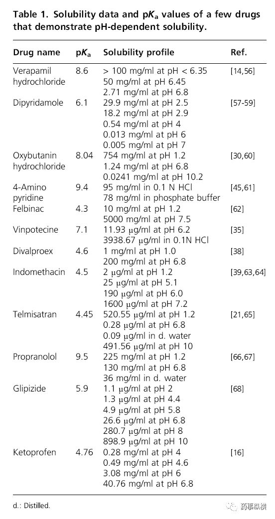表1 一些溶解度具有pH依赖性药物的溶解度及pKa