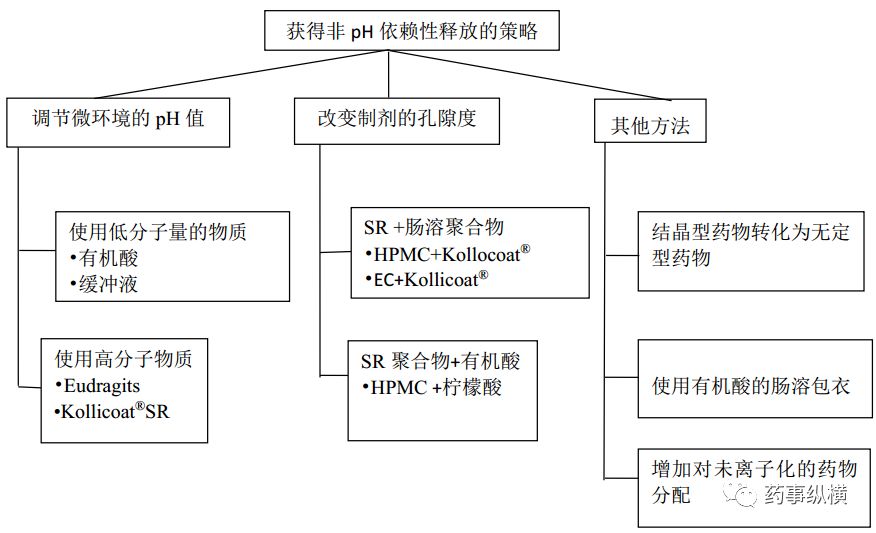 通过使用聚合物包衣或改变药物特性来调节制剂的孔隙度和可蚀性,可以获得非pH依赖性释放曲线。聚合物包衣的缺点是需要小心地改变包衣量以及必须使用SR聚合物和肠溶聚合物百分比。控制药物的结晶度和分配行为的方法具有特异性,不适用于全部弱酸性和弱碱性药物。因此,使用pH调节剂(酸性或碱性赋形剂)是最有效且最常用的方法。
