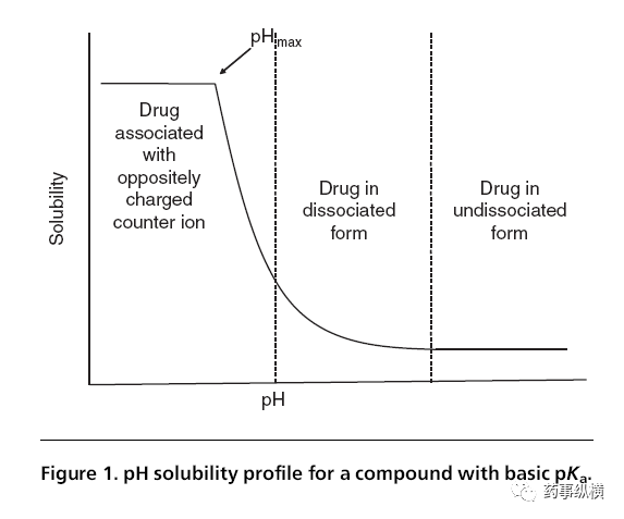 3)pH最大值区域(pH max region.)。该区域对应于最大溶解度的区域。随着pH进一步降低,药物完全电离并与带相反电荷的离子结合。