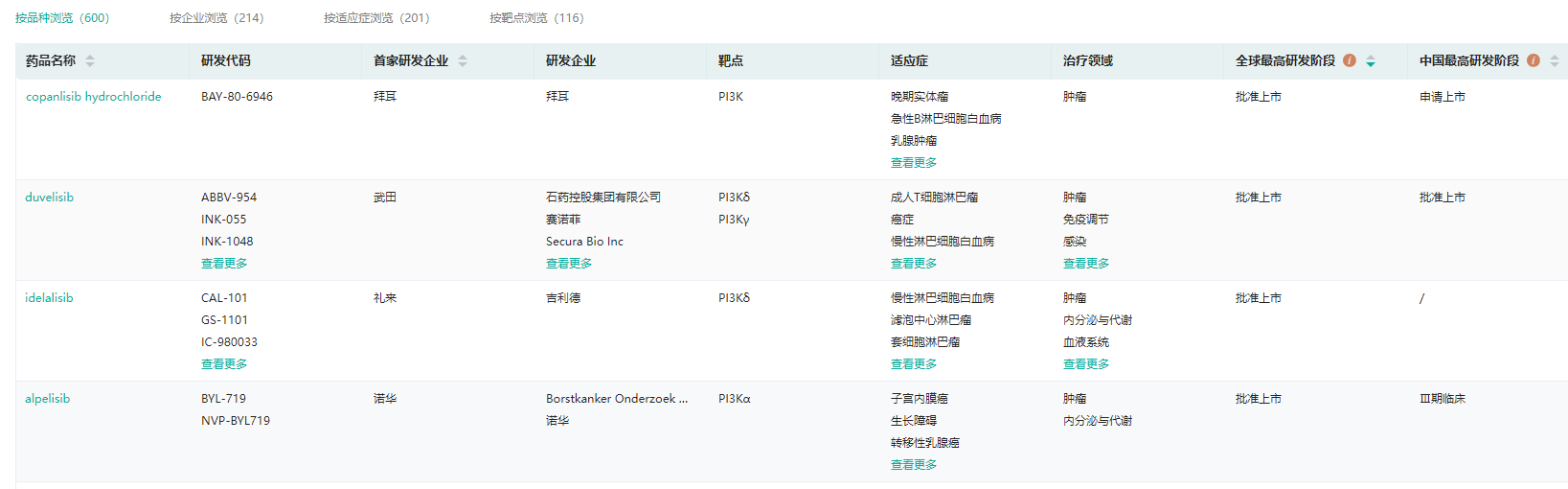 经药融云数据库查询,目前全球已有5款PI3K抑制剂靶向药被批准用于淋巴癌和乳腺癌的治疗,分别为诺华的alpelisib(PI3Kα)、吉利德的idelalisib(PI3Kδ)、Verastem Oncology的duvelisib(PI3Kδ、PI3Kγ)、拜耳的copanlisib(pan-PI3K)和TG Therapeutics的Umbralisib(已撤市),除Copanlisib外,其余均为亚型选择性抑制剂。