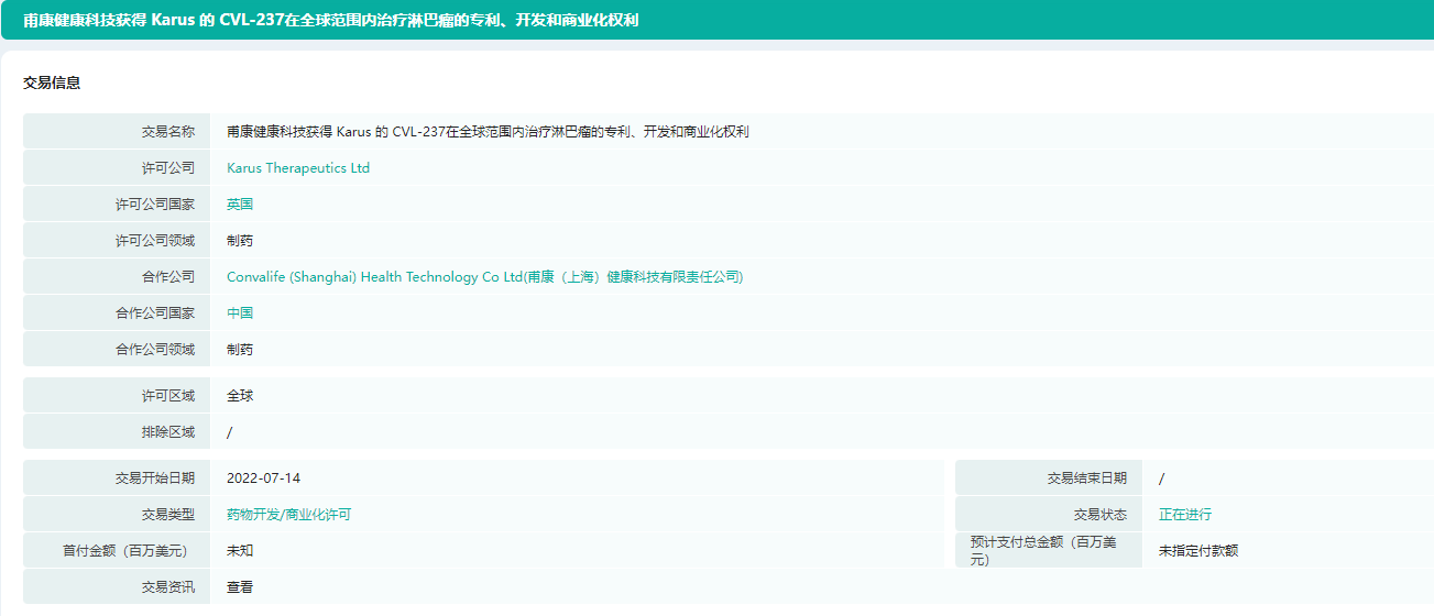 13日,甫康(上海)健康科技有限责任公司宣布,其与英国公司Karus Therapeutics签署收购协议,获得了一款磷酯酰肌醇-3-激酶β/δ双重高选择性抑制剂——CVL237(KA2237)的全球专利、开发及商业化权益。该药是Karus Therapeutics自主研发的口服制剂小分子药物,目前针对B淋巴细胞瘤的临床试验进展最快,已推进到一期。