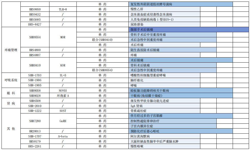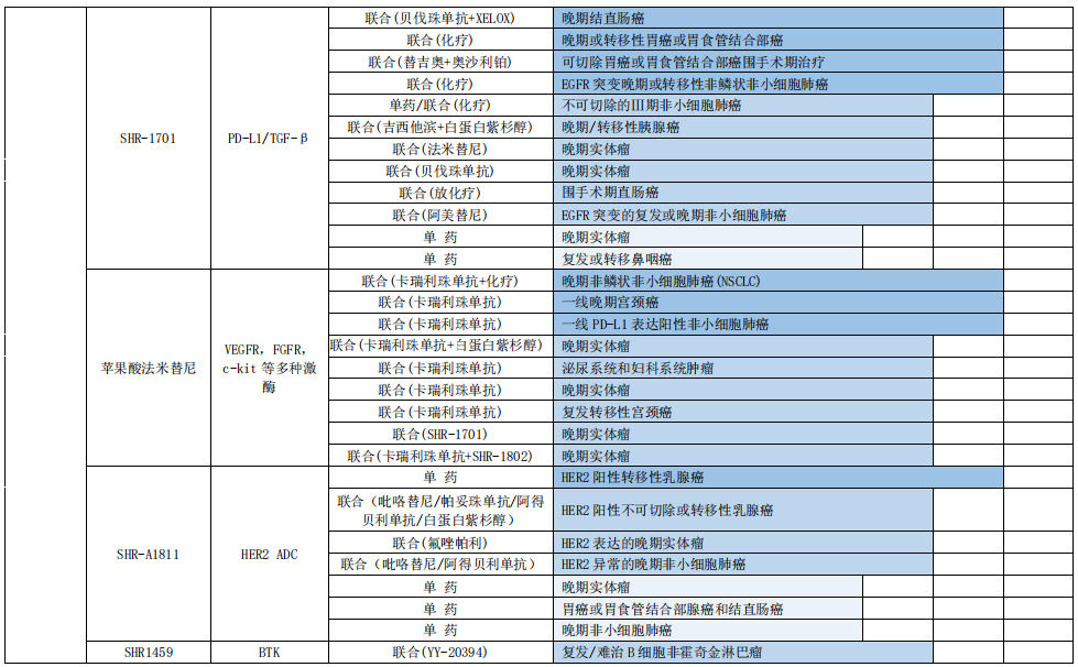 恒瑞医药(含子公司)已上市创新药后续主要临床研发管线