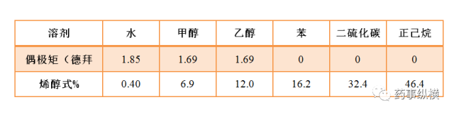 以乙酰乙酸乙酯为例,实验测得,在不同极性溶剂中乙酰乙酸乙酯的烯醇式含量有所差异[1]。表1 中列出18 ℃时,在不同极性溶剂的稀溶液中乙酰乙酸乙酯的烯醇式异构体的含量。