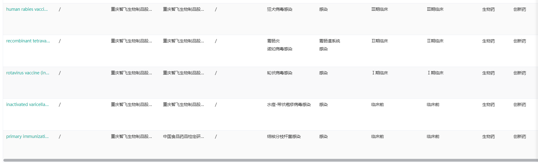 包括重组新型冠状病毒疫苗(CHO细胞)、四价重组诺如病毒疫苗(毕赤酵母)、四价流感病毒裂解疫苗、冻干人用狂犬病疫苗(Vero细胞)、冻干人用狂犬病疫苗(MRC-5细胞)、组份百白破疫苗、卡介菌纯蛋白衍生物、皮内注射用卡介苗、冻干重组结核疫苗、流感病毒裂解疫苗、ACYW135群脑膜炎球菌多糖结合疫苗、15价肺炎球菌结合疫苗、福氏宋内氏痢疾双价结合疫苗、肠道病毒71型灭活疫苗。其中,人用狂犬病疫苗(Vero细胞)研发进展较快,狂犬病毒感染适应症相关临时试验已推进到3期。