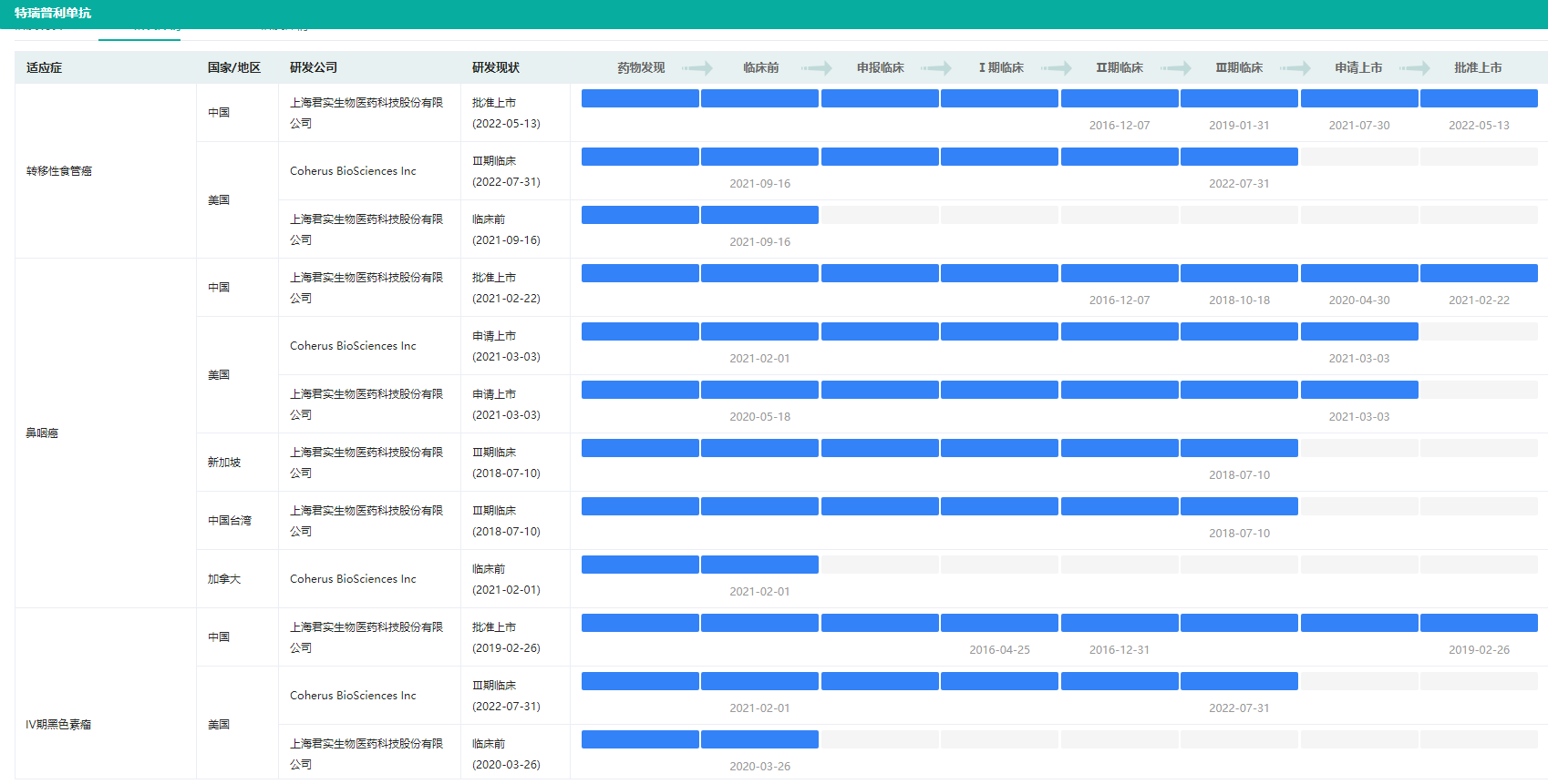 特瑞普利单抗不同适应症研发状态(部分)