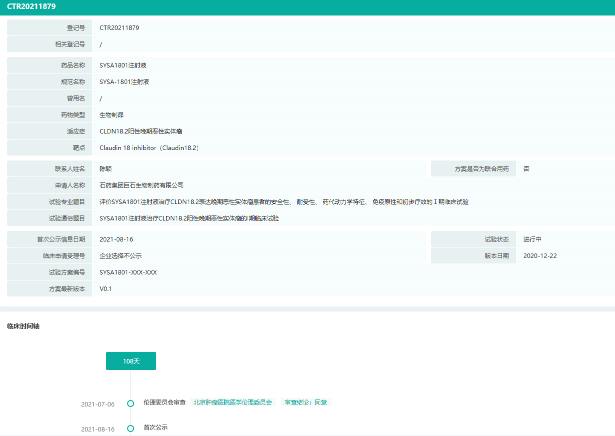 SYSA1801是石药集团在研的一款靶向Claudi18.2的ADC产品。临床前研究表明,SYSA1801对胃癌、胰腺癌和肺癌具有良好的体内外活性和良好的安全性。目前一项评估SYSA1801治疗CLDN18.2阳性晚期恶性实体瘤的安全性、耐受性、药代动力学、免疫原性和初始疗效的I期试验正在中国进行。
