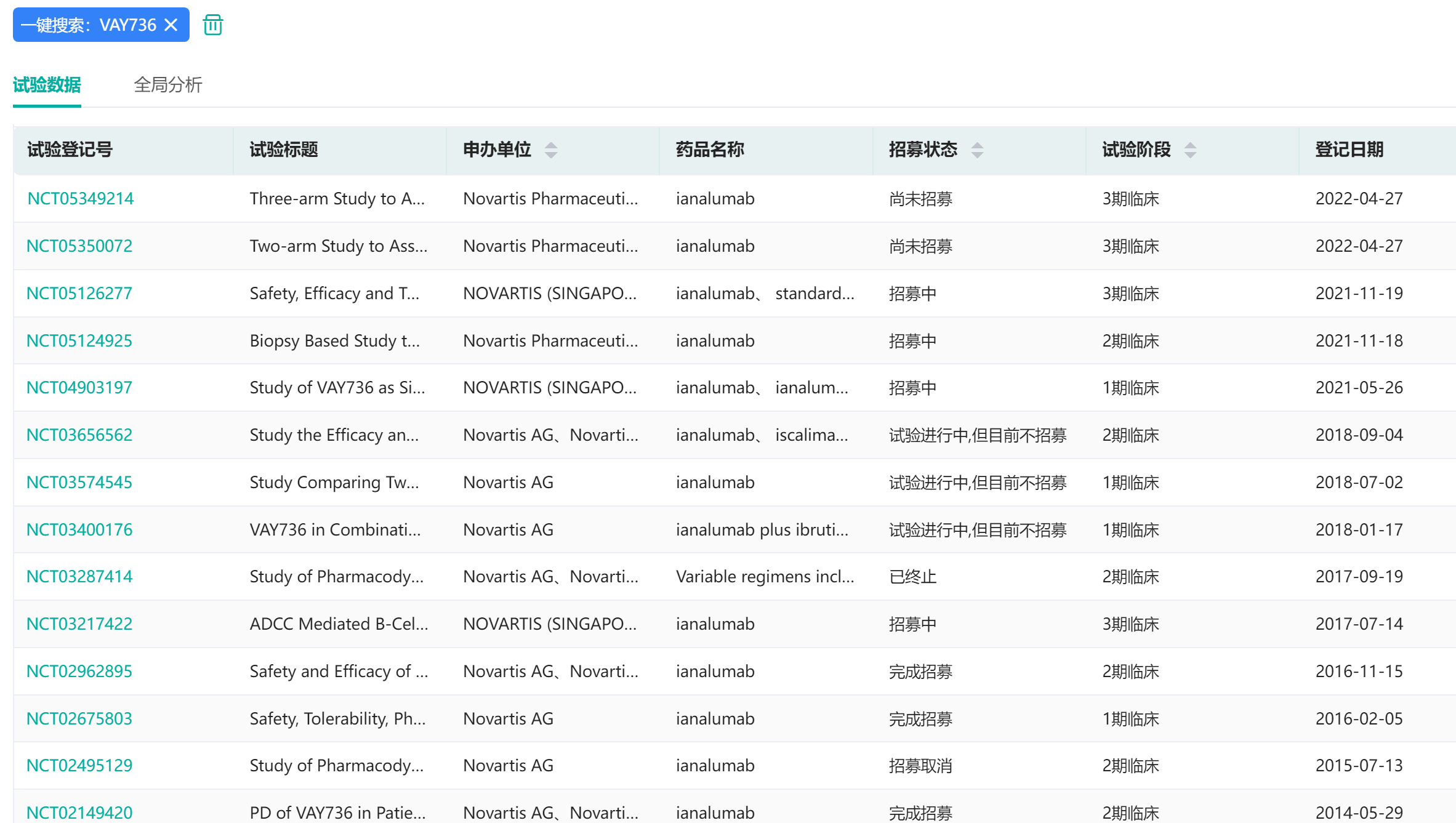 VAY736全球临床试验信息(部分)