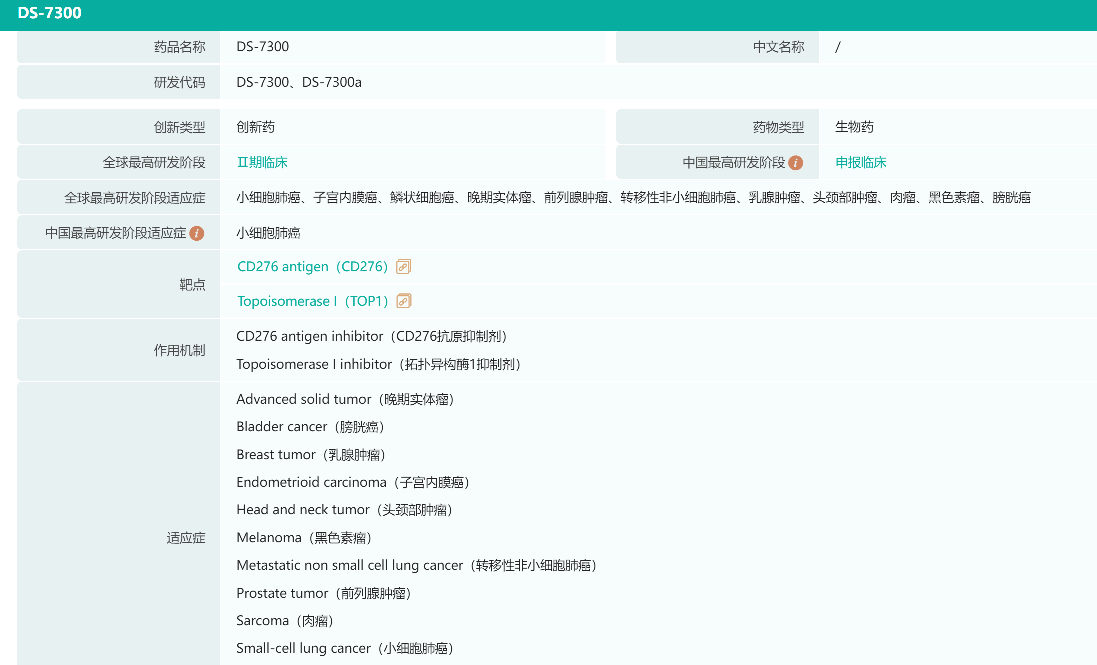 8月3日,第一三共(Daiichi Sankyo)的DS-7300a在中国获批临床,拟用于既往接受过一线或以上治疗的广泛期小细胞肺癌。DS-7300a(DS-7300)是一款靶向B7-H3的抗体偶联药物(ADC),也是第一三共基于其ADC技术平台(DXd ADC)推进临床开发阶段的第4款产品,目前正在海外开展2期临床试验。