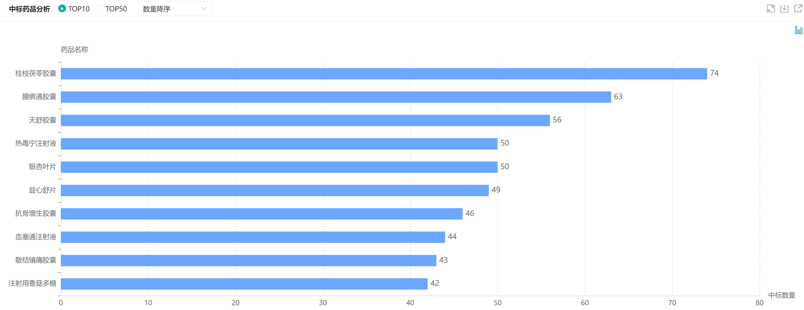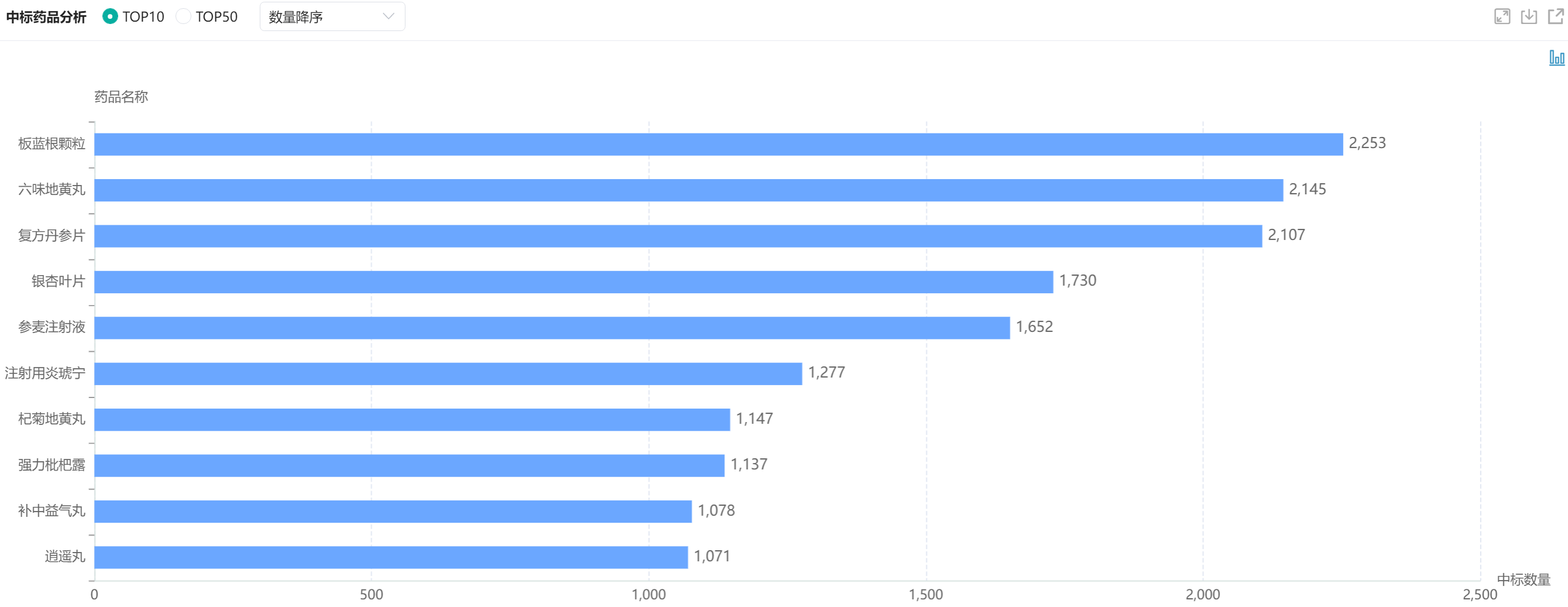 板蓝根颗粒、六味地黄丸、复方丹参片分别以2253个、2145个、2107个中标药品数量位居前三甲。其中,板蓝根颗粒涉及13个品规、7个规格、1个剂型;最新中标价为0.75元,规格为10g,为西安博爱制药有限责任公司的中标药品。六味地黄丸涉及50个品规、50个规格、1个剂型;最新中标价为0.06元,规格为1.44g,为上海宝龙安庆药业有限公司的中标药品。复方丹参片涉及24个品规、23个规格、1个剂型;最新中标价为0.13元,规格为320mg,为广东罗浮山国药股份有限公司的中标药品。