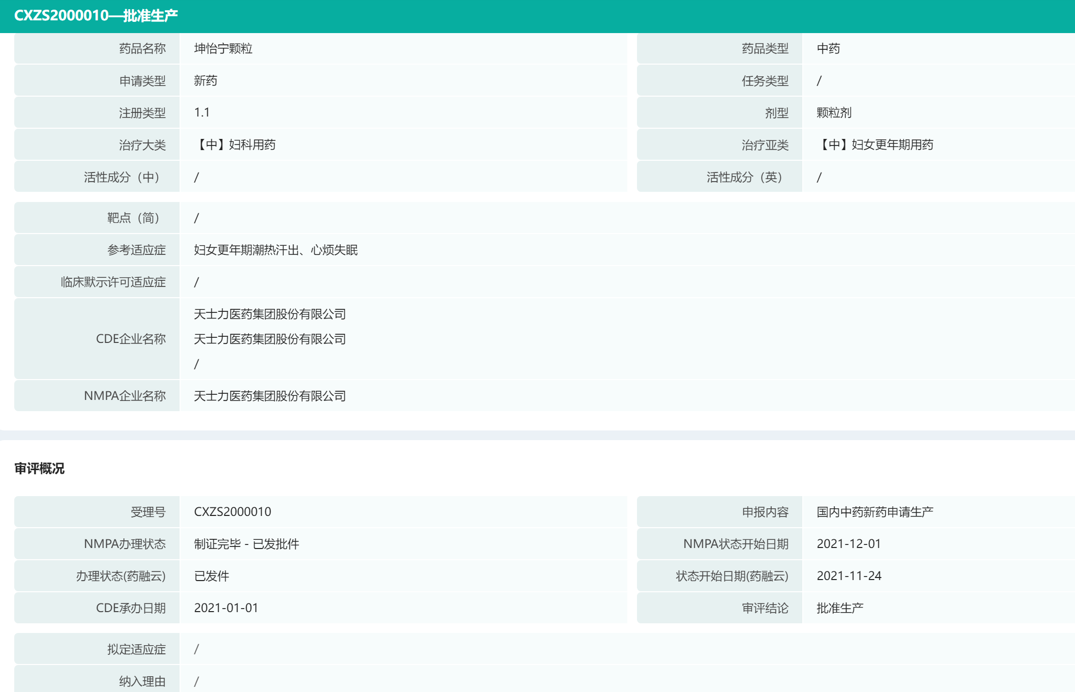 坤心宁颗粒基本信息(部分)