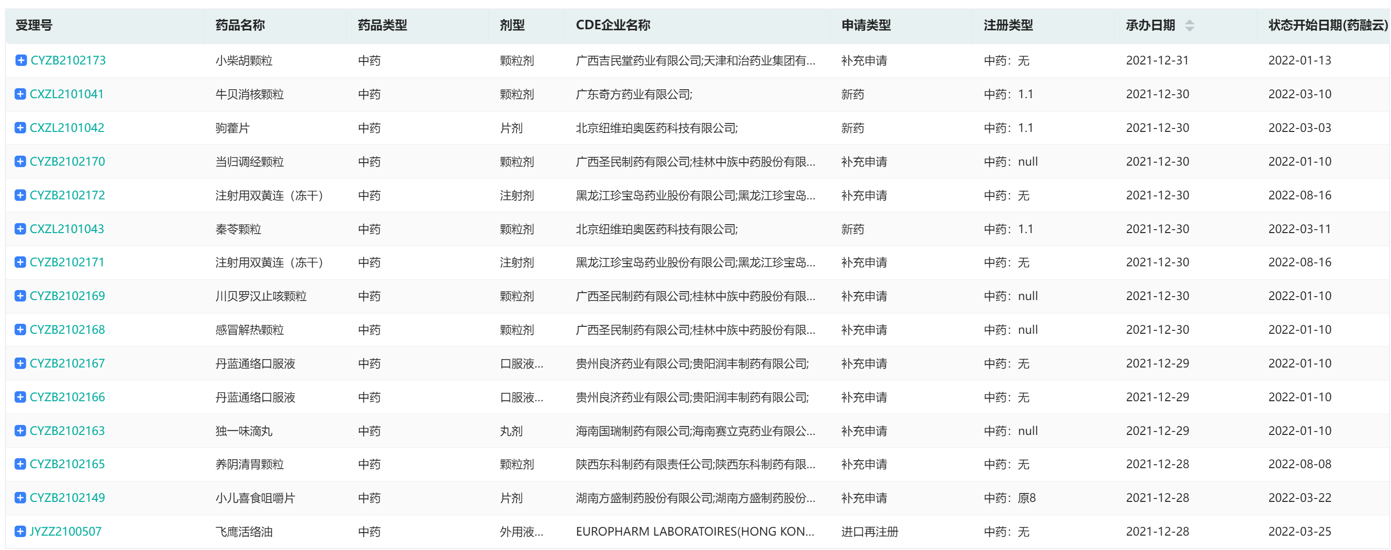 2021年受理的中药注册申请数据(部分)