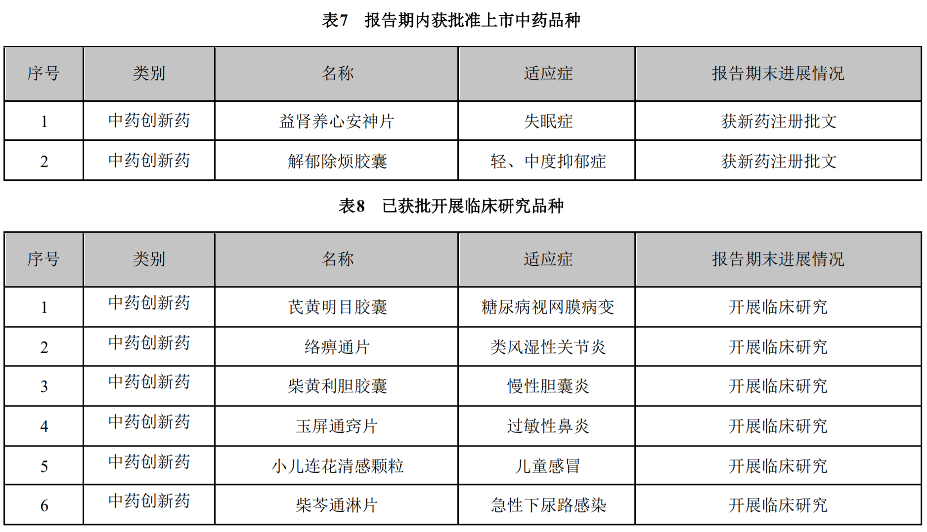 而益肾养心安神片(以岭药业)、益气通窍丸(东方华康医药)、银翘清热片(康缘药业)、玄七健骨片(方盛制药)、芪蛭益肾胶囊(凤凰制药)、坤心宁颗粒(天士力)、虎贞清风胶(一力制药)、解郁除烦胶囊(以岭药业),是在临床经验方基础上研制而成;七蕊胃舒胶囊(健民药业),是在医疗机构制剂基础上研制而成。