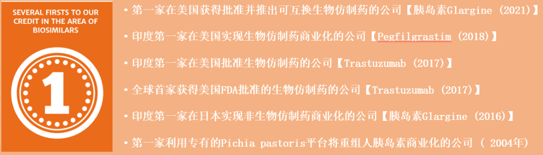 Biocon Biologics Ltd.是一家全球领先的生物类似药(biosimilar)公司,拥有多个上市和研发中的生物类似药,包括治疗癌症和自身免疫性疾病的单克隆抗体、治疗糖尿病的胰岛素和胰岛素类似物以及重组蛋白。公司拥有强大的生物仿制药分子研究管线,涉及糖尿病、肿瘤学、免疫学和其他非传染性疾病,并拥有许多个第一:
