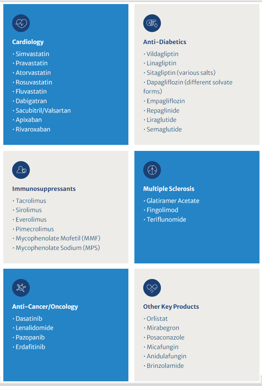 Biocon为100多个国家的1200多家制药公司提供服务,遍布美国、欧洲和大型新兴市场。API产品组合如下: