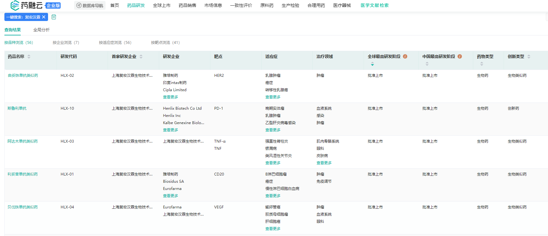 据药融云数据库显示,复宏汉霖目前共有5款创新药产品上市,除斯鲁利单抗外,还有4款生物类似药,分别是曲妥珠单抗类似药、阿达木单抗类似药、利妥昔单抗类似药以及贝伐珠单抗类似药。其中,据药融云统计,利妥昔单抗的商业化效果最好,2021年在我国院内的销售额达到了近12亿人民币。(搜索"药融云小程序"进行相关更多数据查询)