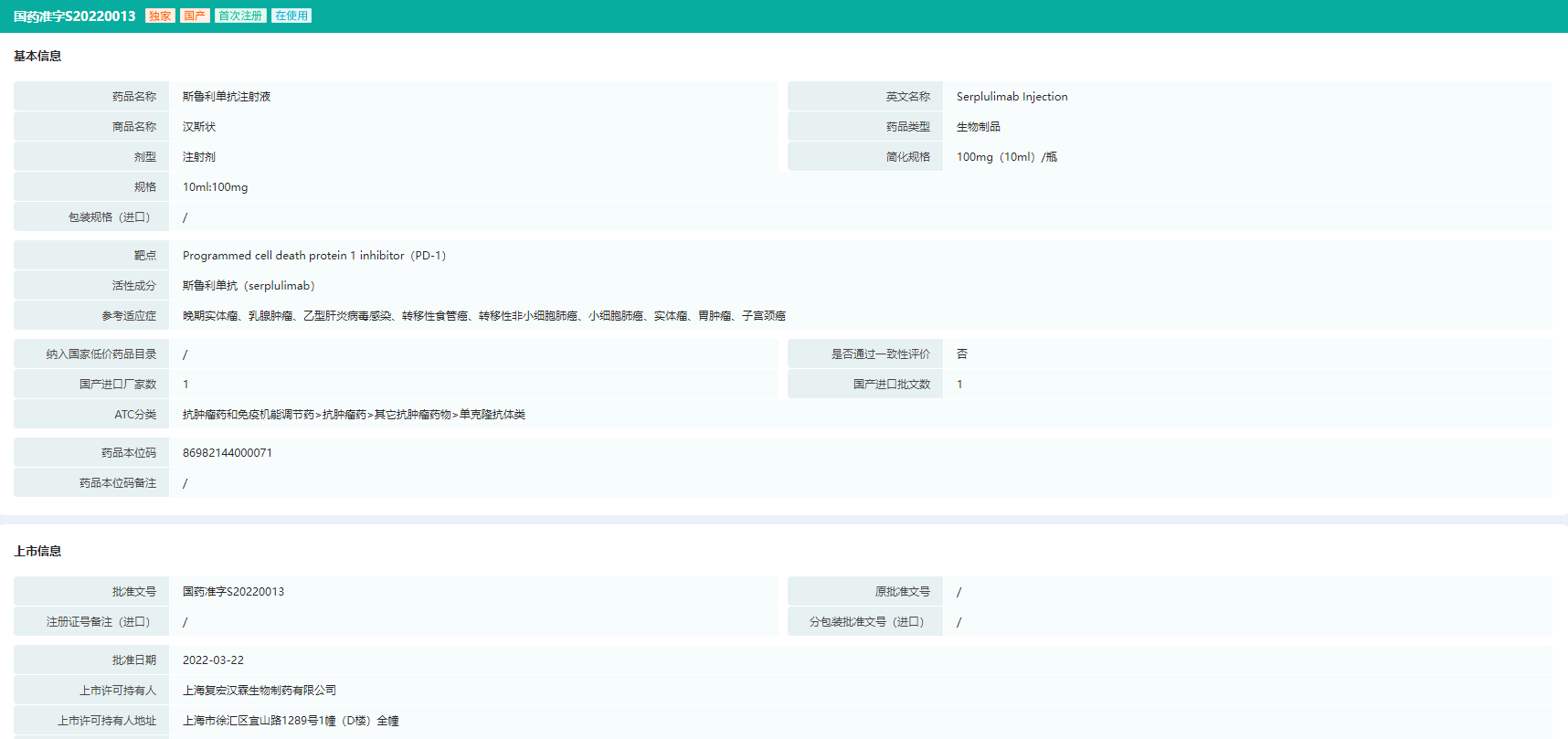 据药融云查询,斯鲁利单抗(汉斯状®)是中国批准的第13个PD-1 / L1抑制剂,是复宏汉霖首个创新型单抗H药,用于治疗微卫星高度不稳定(MSI-H)实体瘤,其鳞状非小细胞肺癌(sqNSCLC)、广泛期小细胞肺癌(ES-SCLC)和食管鳞状细胞癌(ESCC)适应症的上市注册申请也在审评中。
