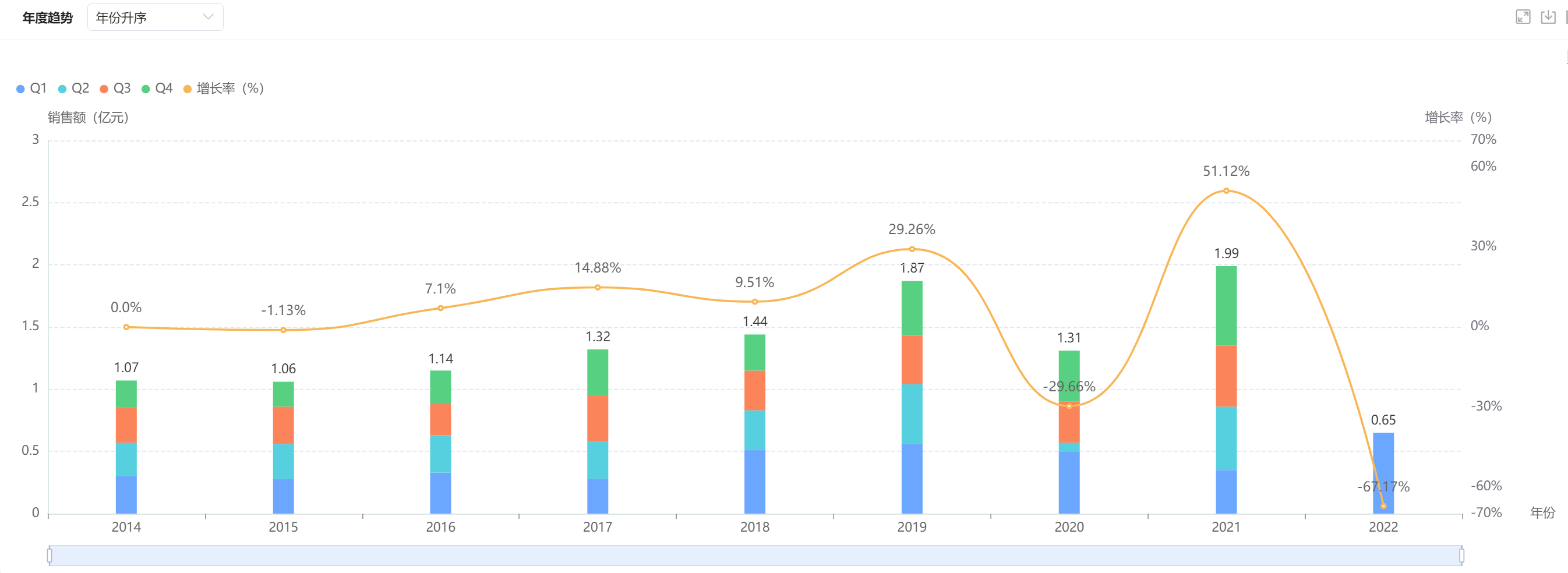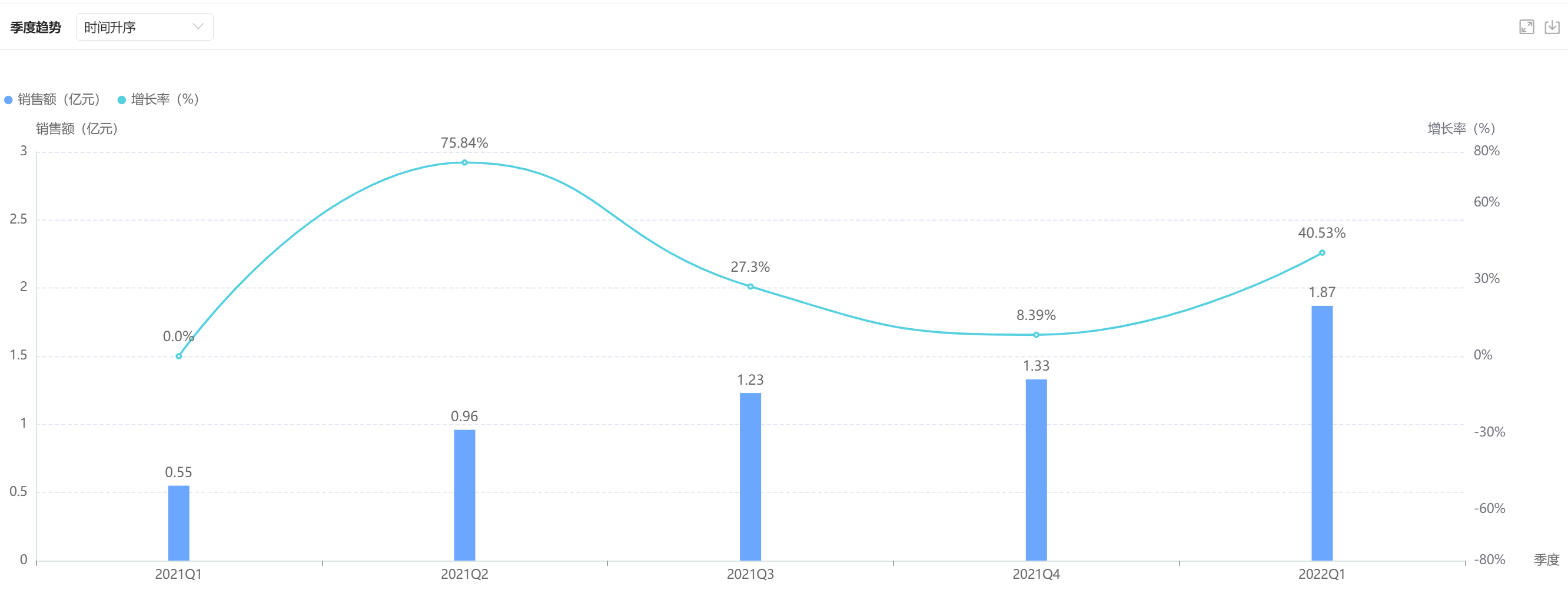 据药融云统计,富马酸福莫特罗近几年在我国院内的销售情况并不理想,但总体也呈递增趋势。2021年出现爆发式增长,突破亿元大关直达四亿,同比增长334.65%。目前2022年Q1销售额已近两亿,预计全年销售额保持大幅上涨趋势。