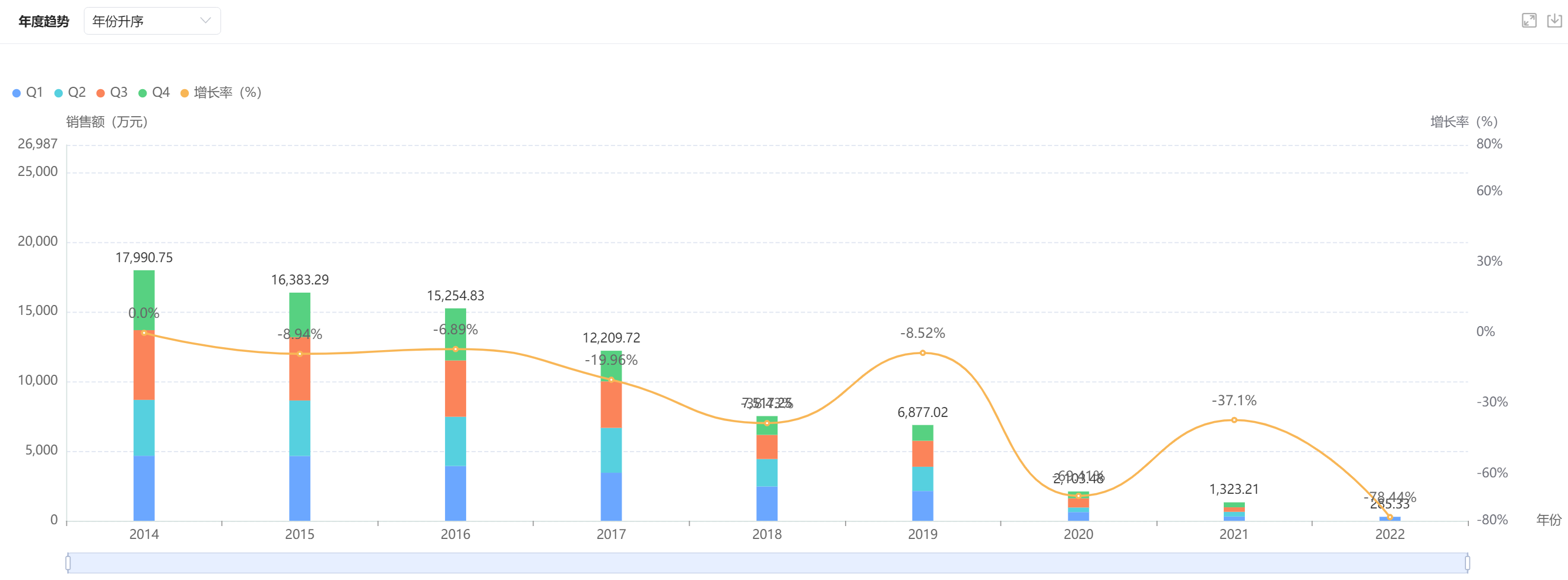 不过,由于喹诺酮类药品抗菌治疗有可能引发相关严重不良反应,2011年国家药监局将帕珠沙星列入《药品不良反应信息通报》的9个品种之一,导致近年来医院用药市场销售额持续下滑。据药融云全国医院销售数据库显示,2020年、2021年帕珠沙星医院端销售额呈悬崖式暴跌,2021年销售额为1323.21万元,同比下降37.1%。