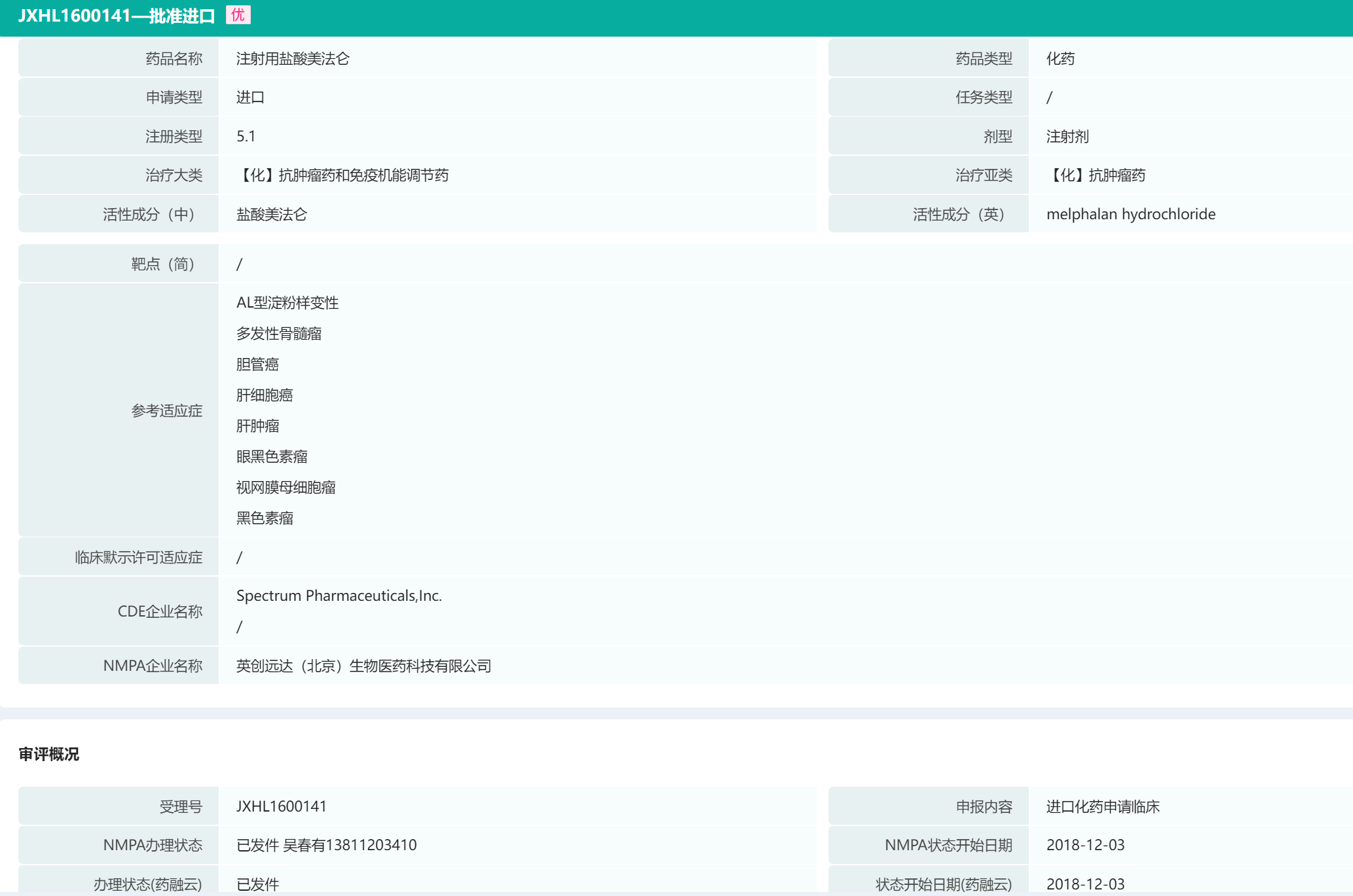 国内仅有1家厂商获批进口注射用盐酸美法仑,凯信远达的迈维宁于2016年11月申请中国上市,2017年6月进入快速审评通道,2018年11月被国家药品监督管理局批准免临床试验上市。