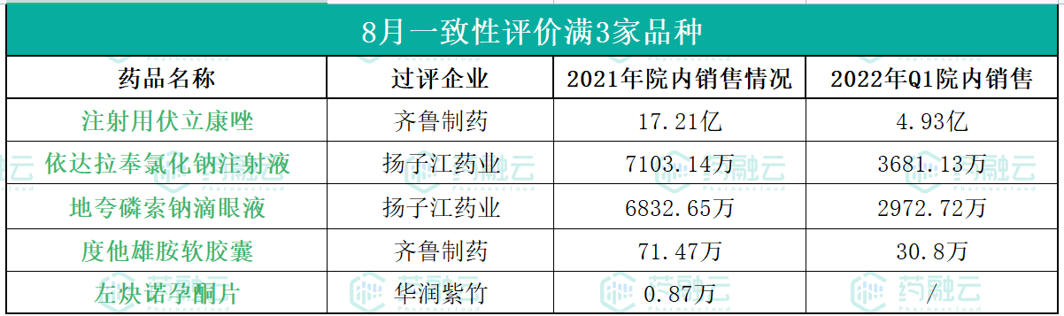 8月一致性评价满三家品种2021年/2022年Q1销售情况(截止28日)