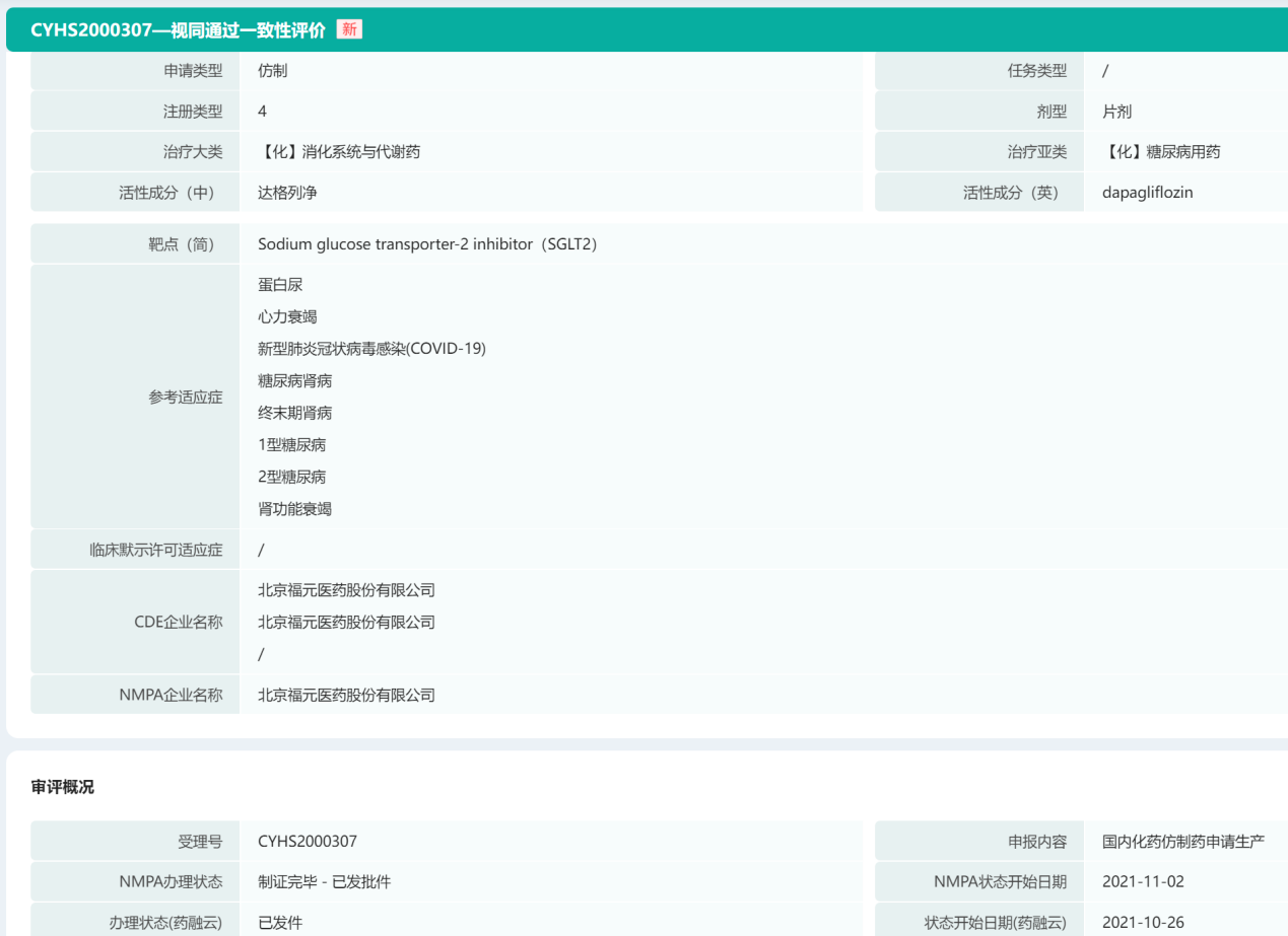 北京福元医药达格列净过评信息(部分)