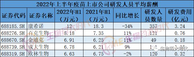 从科创板疫苗上市公司来看,研发人员平均薪酬康希诺生物高一些,其他公司相差不大。百克生物、金迪克和成大生物,研发人员涨薪9%-11%左右。