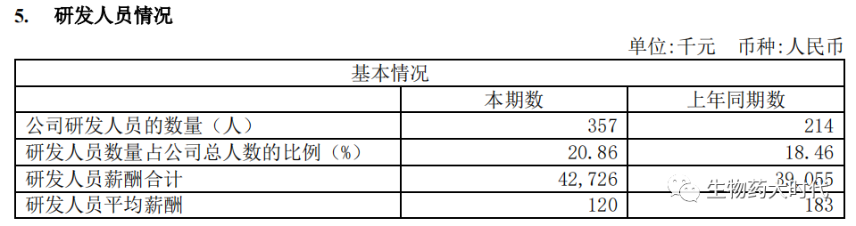 康希诺生物(688185)2022年上半年研发人员平均薪酬12万,同比降幅34%。(去年同期薪酬18.3万元),虽然人均薪酬下降,但是研发人员大幅增加,目前康希诺拥有研发人员357人,同比增长67%,研发人员占公司总人数的比例20.86%。