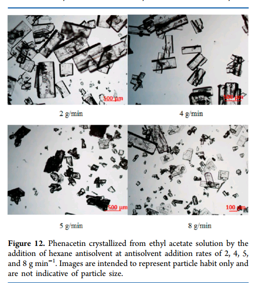 图2:非那西汀在乙酸乙酯(溶剂)与正己烷(反溶剂)中形成的晶体形态,及不同反溶剂(正己烷)加入速度对形态的影响。【见参考文献2】
