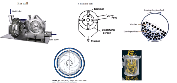 图5:几种常见的粉碎设备,依次为微针(pin mill)粉碎机、锤击式粉碎机(hammer mill)、球磨机(ball mill)、气流粉碎机(Air-jet mill)、圆锥形整粒机(comill)。