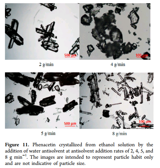 图1:非那西汀在乙醇(溶剂)与水(反溶剂)中形成的晶体形态,及不同反溶剂(水)加入速度对形态的影响。【见参考文献2】