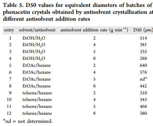 图3:不同溶剂与反溶剂体系,及不同反溶剂加入速率对晶体粒径的影响【见参考文献2】