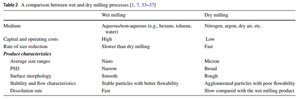 粉碎是制药工业中常见的降低API粒径和(或)使API粒径均一化的方法,尤其对于水难溶性药物。粉碎可以看做是一种“从上至下”的过程,即大的粒径已经形成,再通过外力输入能量使大粒径API降低为小粒径。通常粉碎可以分为两大类:干法粉碎和湿法粉碎,湿法粉碎的介质为水或非水溶剂,干法粉碎的介质为空气、氮气、氩气等气体。两种粉碎的特点比较如图4所示,一般湿法粉碎粒径可以达到纳米级(如纳米晶制备通常选用该方法),干法粉碎粒径可以达到微米级。当然湿法粉碎消耗的能量较多,干法粉碎消耗能量较少。湿法产生的颗粒较光滑,干法则相对粗糙等等。