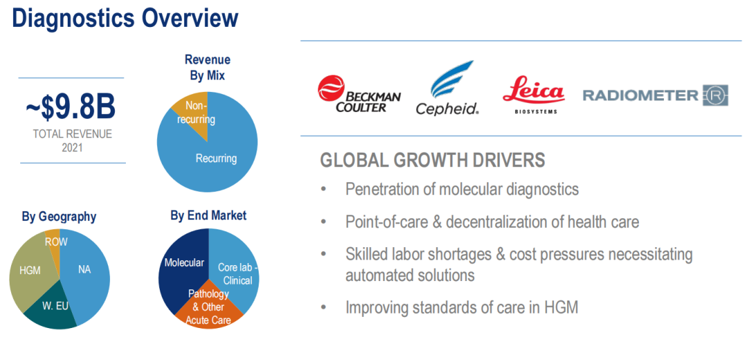 丹纳赫诊断部门提供临床仪器、试剂、耗材、软件和服务,供医院、诊所、参比实验室和其他重症监护机构用于诊疗决策。公司于2004年通过收购Radiometer建立了诊断业务,并通过随后的多次收购扩大了业务,包括2006年的Vision Systems、2011年的Beckman Coulter、2012年的Iris International和Aperio Technologies、2013年的HemoCue、2014年的Devicor Medical Products、2015年的西门子医疗诊断临床微生物业务以及2016年的Cepheid。
