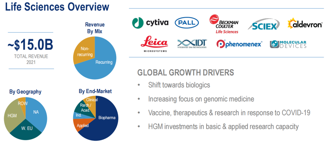 丹纳赫的生命科学部门提供广泛的仪器和耗材,用于生命科学领域的研究,包括基因、蛋白质、代谢物和细胞,以了解疾病的原因、确定新疗法,以及检验和制造新药和疫苗。丹纳赫于2005年通过收购Leica Microsystems建立了生命科学业务,并通过多次后续收购扩大了业务,包括2010年收购ABSciex和Molecular Devices、2011年收购Beckman Coulter、2015年收购Pall、2016年收购Phenomenex、2018年收购IDT、2020年的Cytiva和2021年的Aldevron。