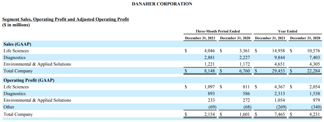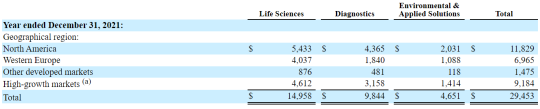 - 其中丹纳赫生命科学部门业绩149.58亿美元,同比增长41.5%。主要是由于客户对研发和生产COVID-19相关疫苗和治疗药物的产品需求持续强劲;生物制药和微电子终端市场对过滤、分离和纯化技术服务需求强劲;但部分被航空航天终端市场的需求疲软所抵消。从地域上看,以北美、西欧和中国为首的所有主要地区对该部门产品的需求都有所增加。丹纳赫在2020年3月对Cytiva的收购以及2021年8月对Aldevron的收购扩大了公司业务,提供了额外的增长动力,2021年,Cytiva的业务收入达到了约60亿美元,远高于收购前的30亿美元。该部门2021年业绩在各地区分布为:北美36%、西欧27%、其他发达市场6%、高增长市场31%。