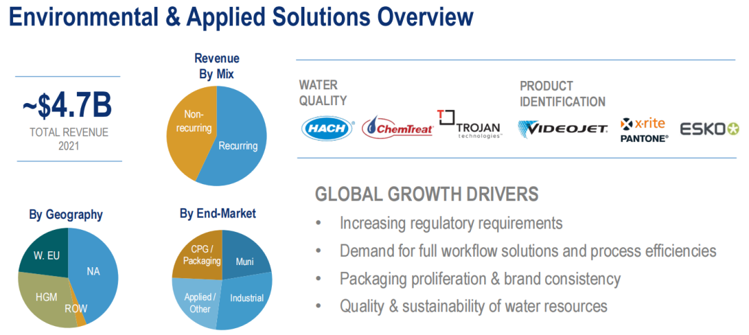 - 环境和应用解决方案部门业绩46.51亿美元,同比增长8%。由于2021年COVID-19疫情影响逐渐缓解,市场对于消耗品、设备的需求逐渐复苏,丹纳赫该部门水质业务和产品标识业务均有所增长。该部门2021年业绩在各地区分布为:北美44%、西欧23%、其他发达市场3%、高增长市场30%。