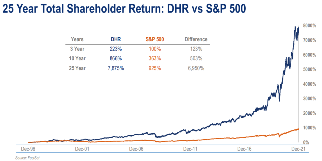 下图为近25年丹纳赫(NYSE:DHR)股价表现与标准普尔500指数的对比。在过去20年中,公司的股票表现超过标准普尔500指数1200%。
