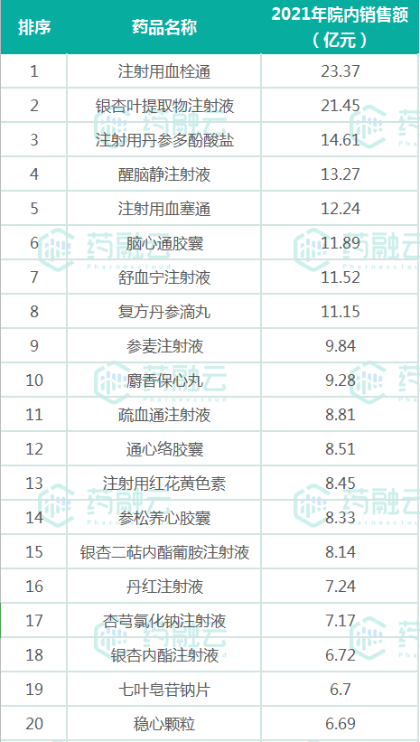2021年心血管中成药院内销售TOP20品种(微信搜索"药融云小程序"进行相关更多数据查询)