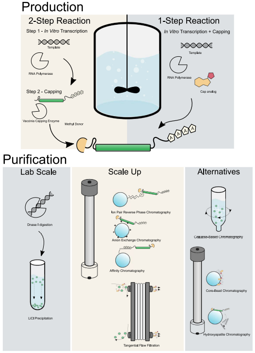上游产生的mRNA需通过多个纯化步骤从反应混合物中分离和纯化,以达到临床质量要求。反应混合物不仅包含所需mRNA,还包含许多杂质,如酶、残余NTP和DNA模板,以及转录期间形成的异常mRNA(如dsmRNA)。