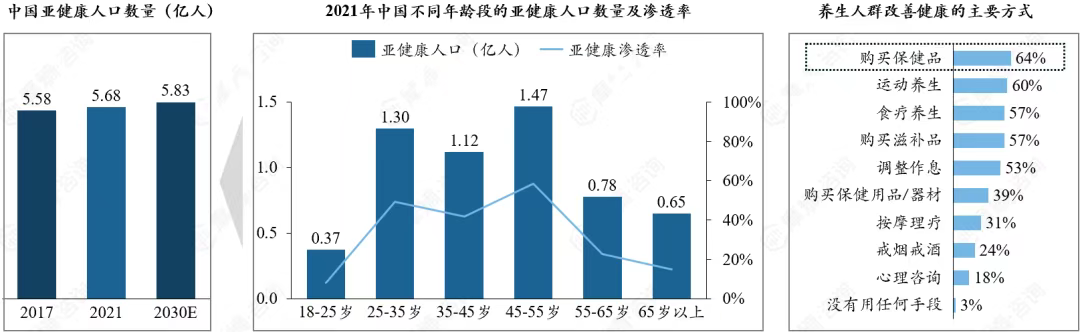 保健品是亚健康调理的最重要的手段,有64%的养生人群会选择购买保健品。随着大众健康意识的提升,针对不同年龄段、不同亚健康症状的功能性保健品需求持续攀升,保健品将受到越来越多消费者的青睐,未来发展潜力巨大。