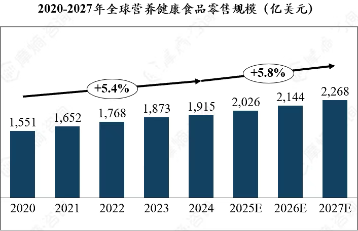 据仙乐健康公告援引欧睿数据,2024 年全球营养健康食品零售规模达到 1,915 亿美元。过去五年的年均复合增长率为5.4%,预计未来三年将保持5.8%的稳健增速,到2027年全球规模将达2,268亿美元。
