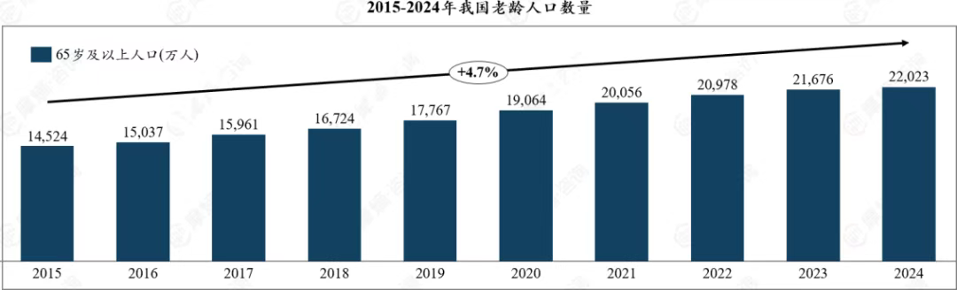 在健康意识普及与生活品质追求的双重驱动下,保健品的消费人群逐渐向全年龄段拓展。但不可忽视的是,老年人始终是保健品消费的中坚力量。近十年间,我国 65 岁及以上人口以 4.7% 的复合增速稳步上扬,截至 2024 年,老年群体规模已突破 2.3 亿人。如此庞大的基数,为保健品老年市场筑牢根基。