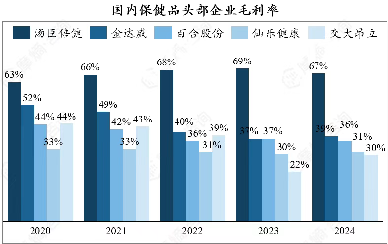 保健品行业原料供应、代工生产、终端品牌各环节的中资头部企业,毛利率水平方能处于适中区间。仅汤臣倍健等头部终端品牌凭借规模优势与强大议价能力,毛利率方能显著领先。