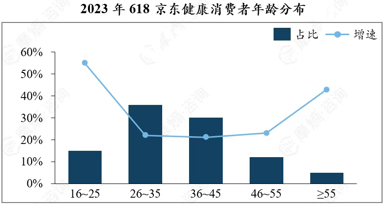 年龄层面,16-25岁年轻消费者增速远超其他年龄段。《2023年618健康消费及营销趋势洞察报告》数据显示,京东健康平台 16-25 岁年轻消费者群体规模呈现爆发式增长,同比增速近 60%。这一趋势折射出 Z 世代群体(通常指出生于 1995 年至 2009 年之间的人群)健康意识的觉醒 —— 他们不再将保健品局限于中老年需求,而是主动通过营养补充剂、功能性食品等产品,应对熬夜、焦虑、亚健康等年轻化健康问题,推动行业消费客群结构重构。